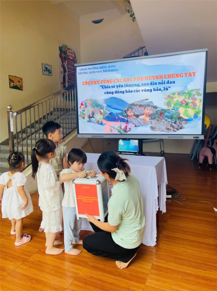 Trong những ngày qua khi đồng bào ta phải vượt qua rất nhiều khó khăn để khắc phục những thiệt hại do thiên tai gây ra cũng là lúc tinh thần “Tương thân Tương ái ” của người Việt lại sáng lên mạnh mẽ. Từ khắp mọi miền đất nước, những tấm lòng nhân ái cùng hướng về những nơi chịu ảnh hưởng của bão, lũ, chia sẻ từng bao gạo, manh áo, thùng mì...hay đơn giản chỉ là những lời động viên ấm áp. Dù ít hay nhiều, tất cả đều xuất phát từ trái tim yêu thương, cùng mong đồng bào sớm vượt qua khó khăn, ổn định cuộc sống. Chính tinh thần đoàn kết, đùm bọc ấy đã làm nên sức mạnh Việt Nam — một dân tộc luôn biết yêu thương và nắm tay nhau trong hoạn nạn. Trước những lời kêu gọi của các tổ chức xã hội.Chiều ngày 14/10/2025 trường Mầm non Bạch Đằng đã phát động tới toàn thể CBGV nhân viên cùng các bậc phụ huynh chung tay chia sẻ yêu thương, xoa dịu nỗi đau đồng bào các vùng bão, lũ. Chỉ trong một thời gian ngắn phát động đến 17h30 cùng ngày số tiền ủng hộ tổng có được là 25.200.000. Toàn bộ số tiền sẽ được nhà trường trao tặng về UBMTTQVN Phường Hồng Bàng trong Hội nghị vào ngày 15/10/2025. Xin được trân trọng cảm ơn các bậc phụ huynh cùng tập thể nhà trường về những tấm lòng nhân ái, những nghĩa cử cao đẹp vô cùng quý giá, là niềm động viên to lớn kịp thời giúp bà con vùng bão, lũ thêm vững tin vượt qua mất mát sớm ổn định trong cuộc sống. Góp phần xoa dịu nỗi đau và mang hơi ấm tình người lan tỏa khắp nơi.