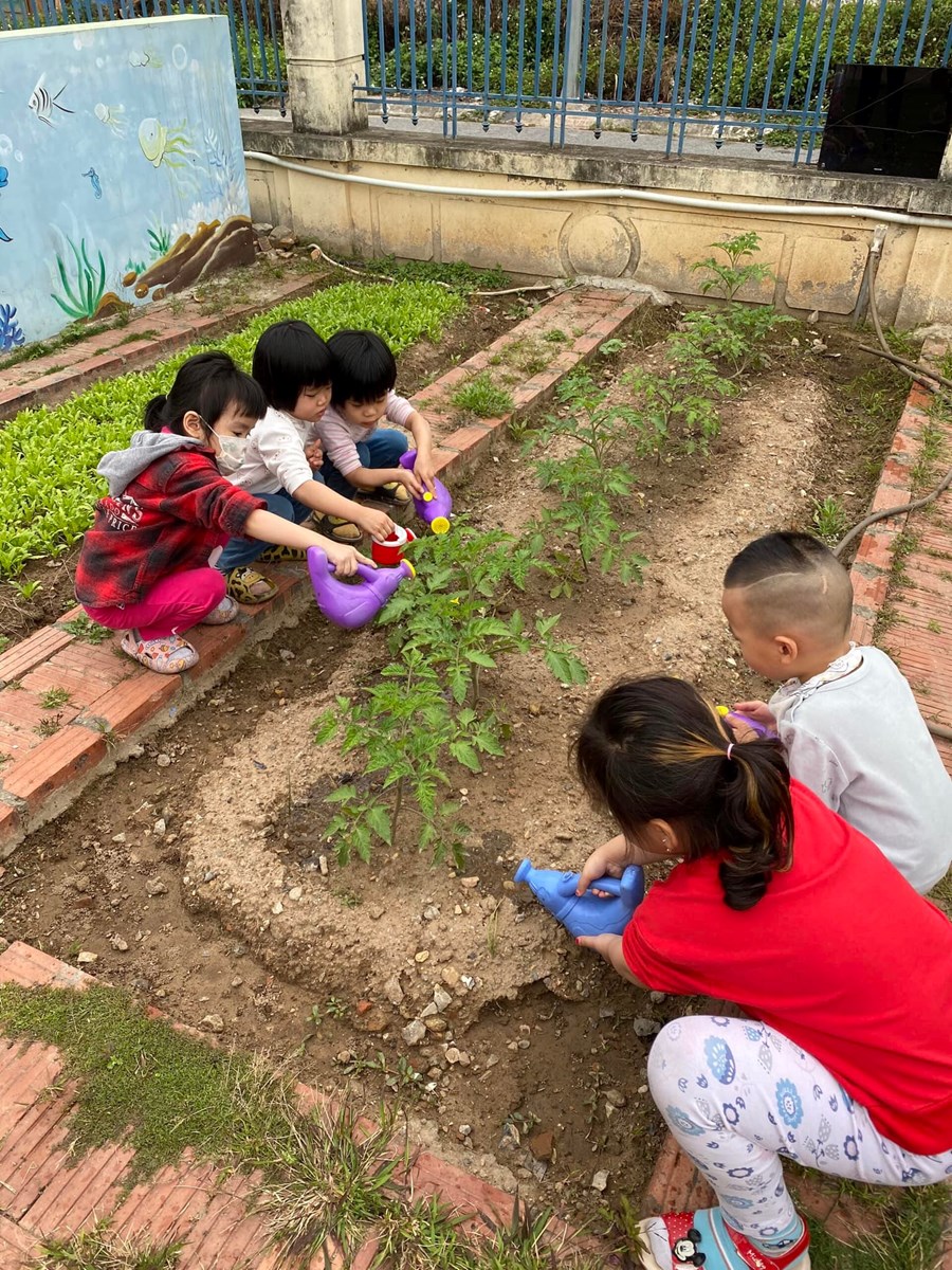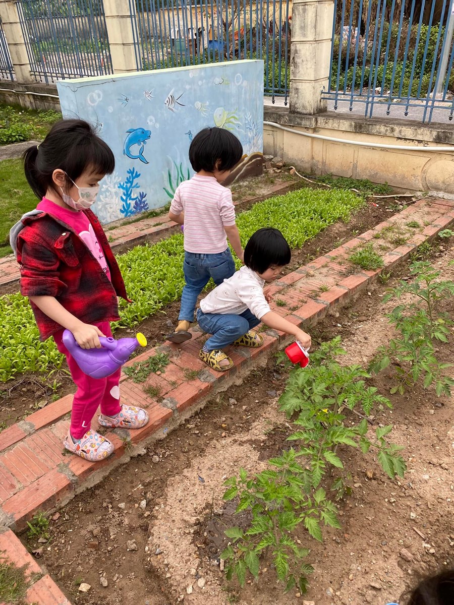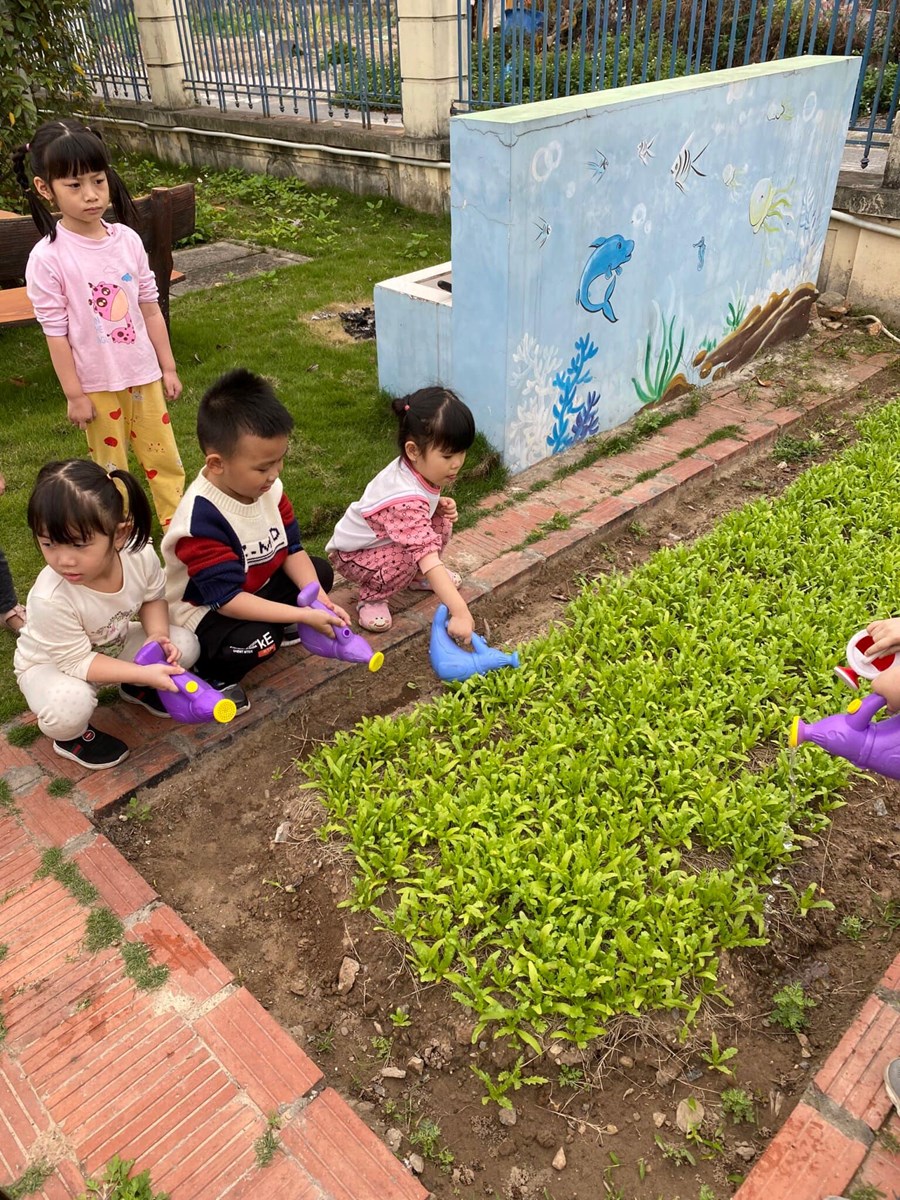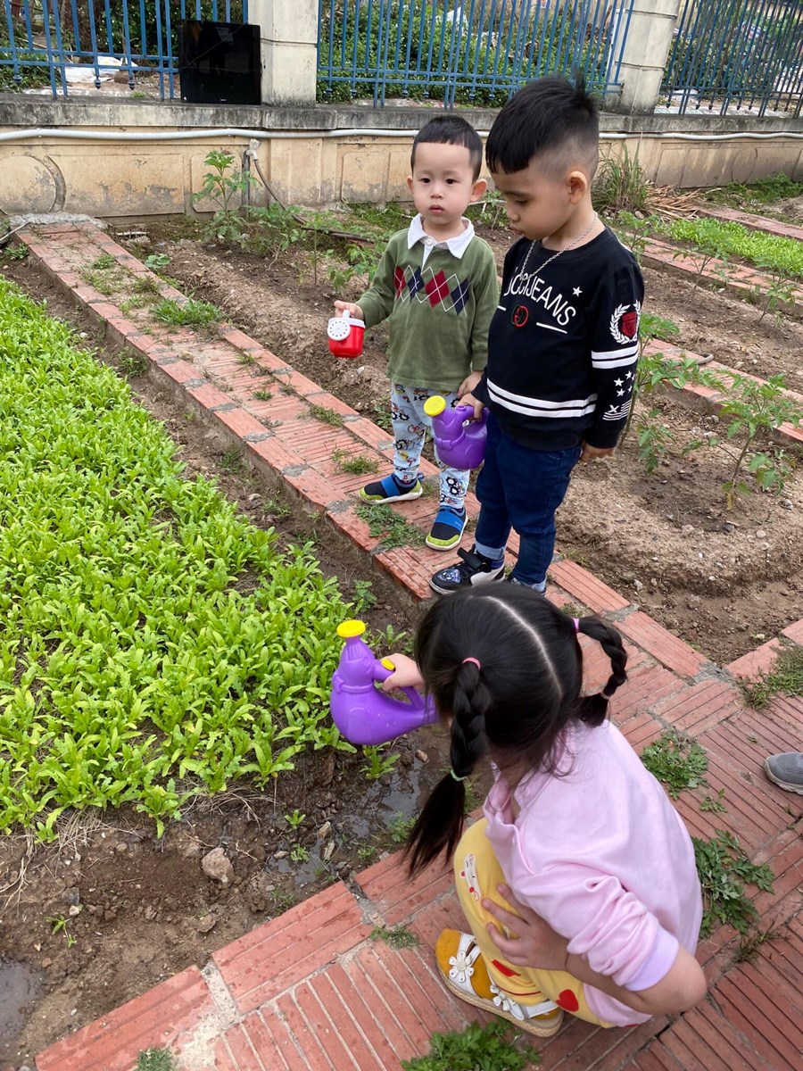 Sau những giờ hoạt động trên lớp, các bé được hòa vào thiên nhiên, khu sân vườn náo nhiệt hẳn. Không những bé trồng cây chăm sóc cây mà bé còn được tự tay bắt sâu, tưới nước, nhổ cỏ cho vườn rau nhỏ trong sân trường. Với hoạt động này tất cả các bé đều rất hứng thú, không những giúp bé biết cách chăm sóc cây, rau tác dụng của các loại rau, của cây xanh đối với cơ thể mà còn giúp cho trẻ tích cực ăn nhiều rau xanh, hoa quả trong bữa ăn hàng ngày.